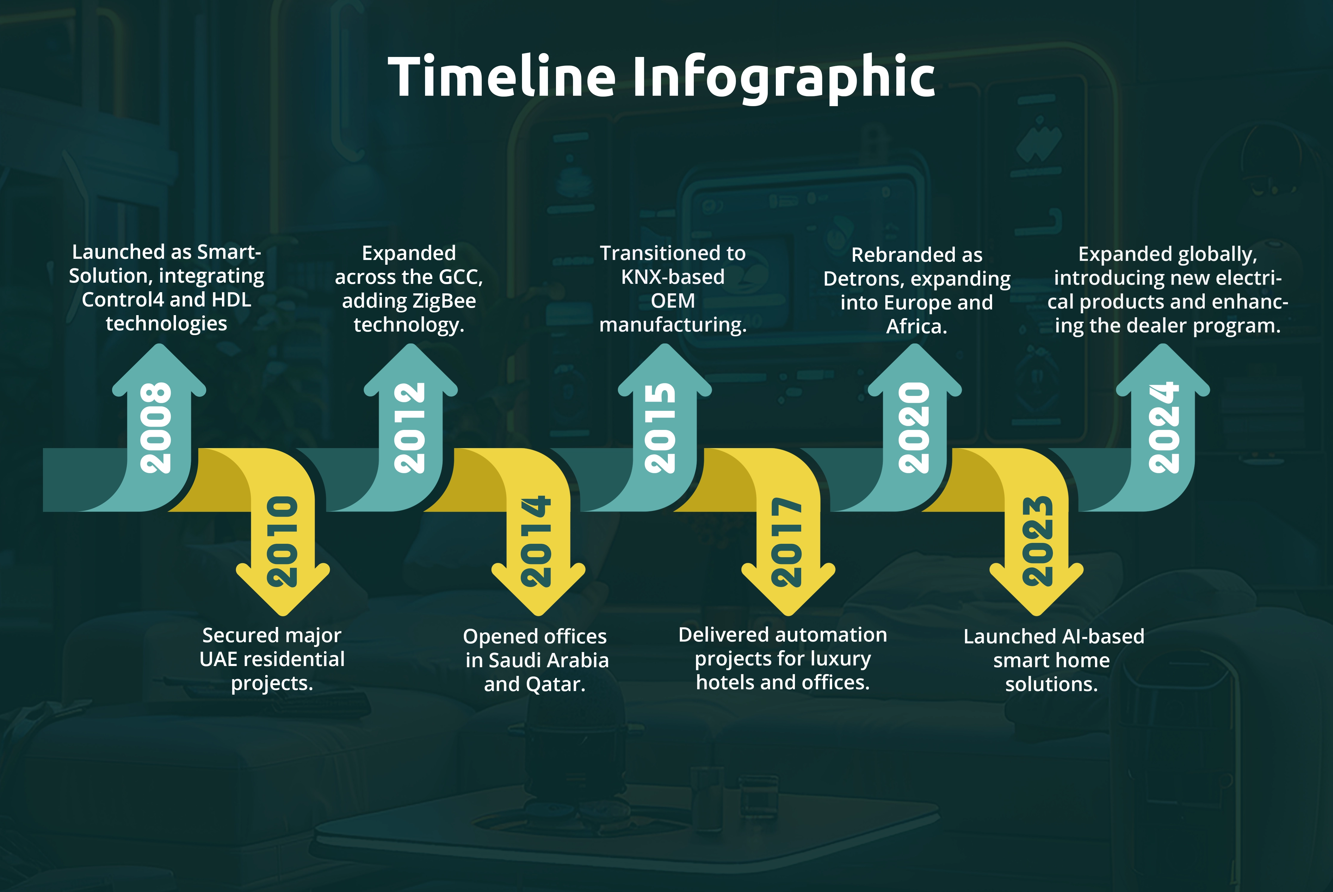 Detrons was founded with a vision to revolutionize automation, backed by 17 years of experience in integrating smart home solutions across the GCC and beyond. From humble beginnings as a home automation integrator, we evolved into a full-fledged automation solutions provider, driven by our deep knowledge of technologies like Control4, ZigBee, and KNX. Today, Detrons is recognized for its commitment to delivering cutting-edge, reliable, and scalable automation systems across residential, office, school, and hotel environments.